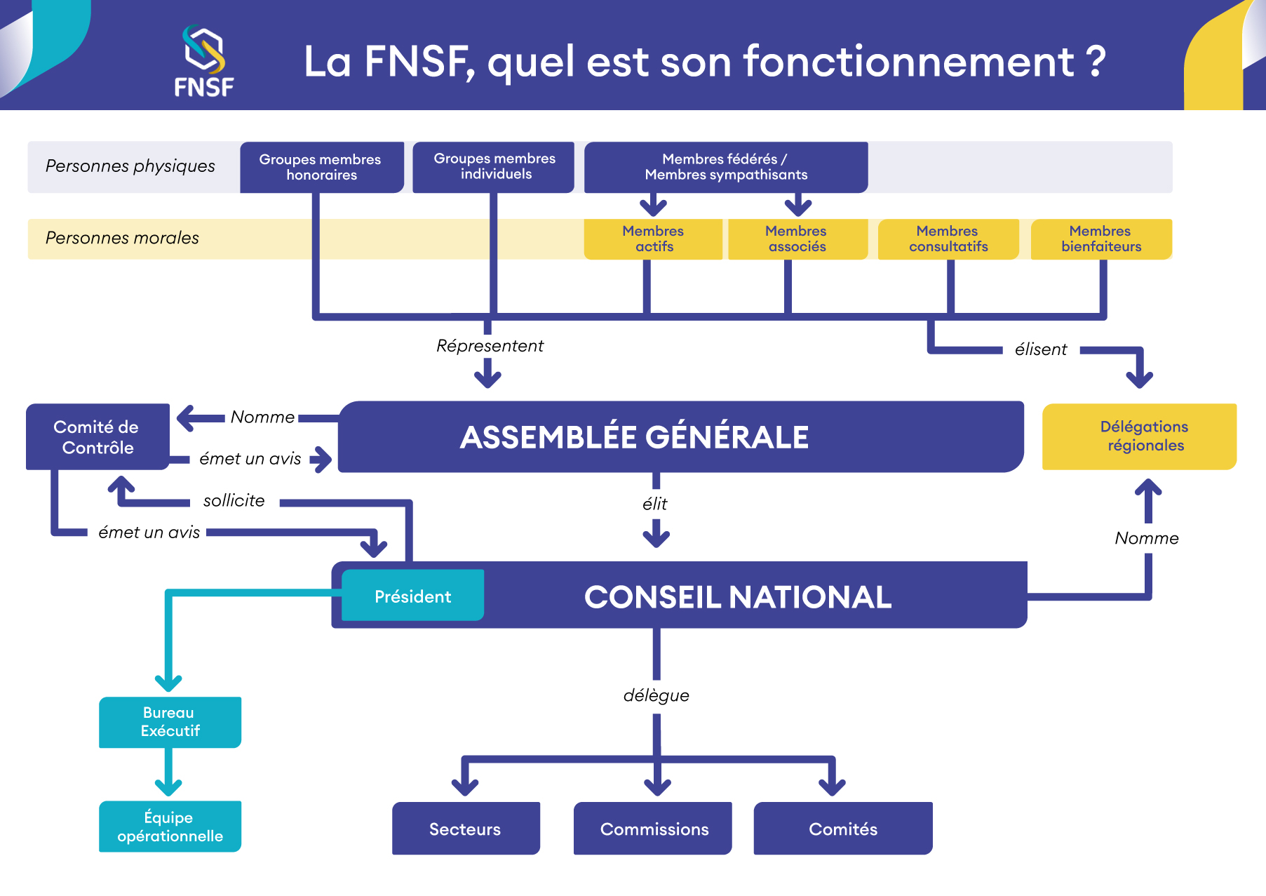 Une Assemblée Générale annuelle, composée des représentants des associations membres. Elle vote les grandes orientations, le budget, les rapports d’activité, et élit les membres du Conseil National.